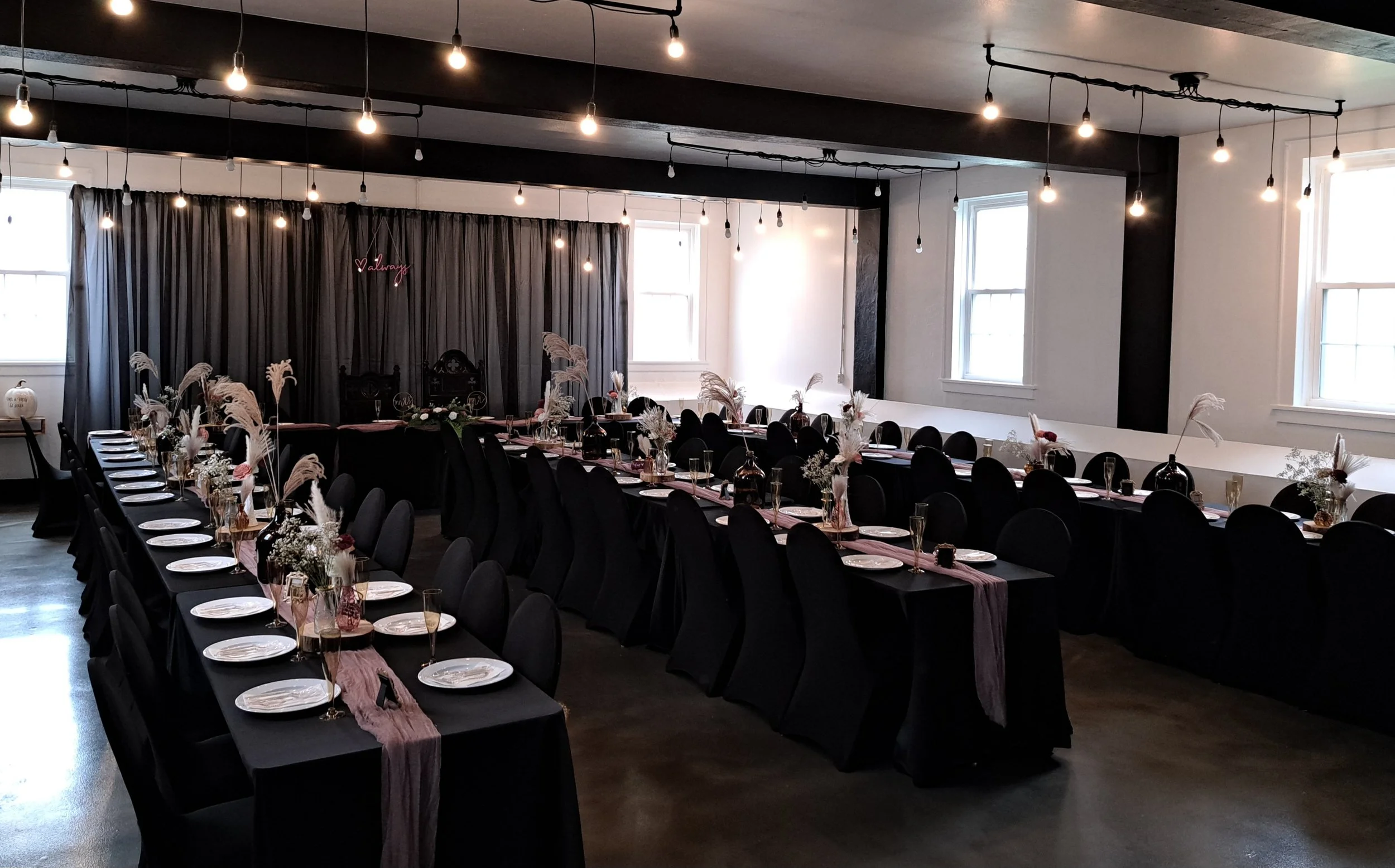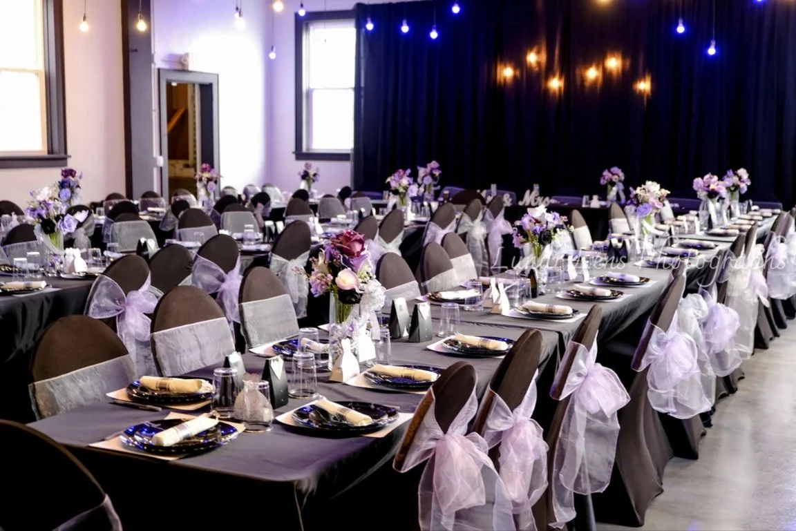 Full access to the whole venue, this includes both the ceremony and reception space, prep kitchen and 2 suites to get ready in. In house staff members and coordinator. Use of our linens and decor, this includes tablecloths, chair covers, table runners, napkins, chair sashes, arch drapery & curtains, centerpieces, candle holders, candles, florals, garlands, signs, card boxes arches, photo backdrops, full set of dinnerware, and more. 5 hours of bartending, 6 hours of DJ service and Ordained Minister. Service for up to 85 guests.