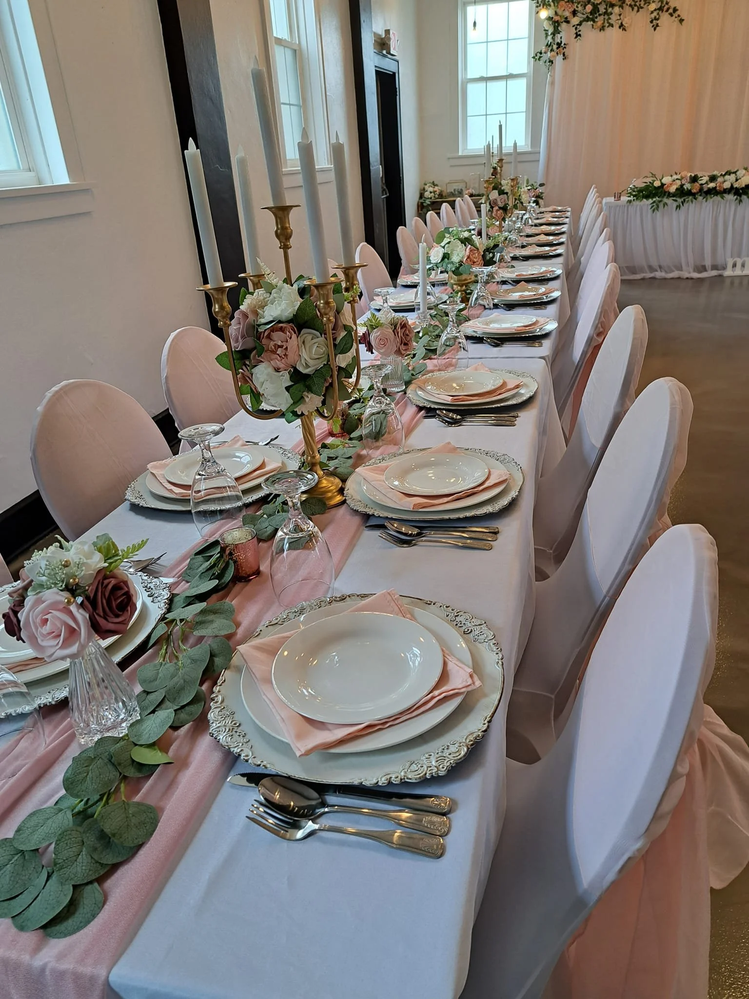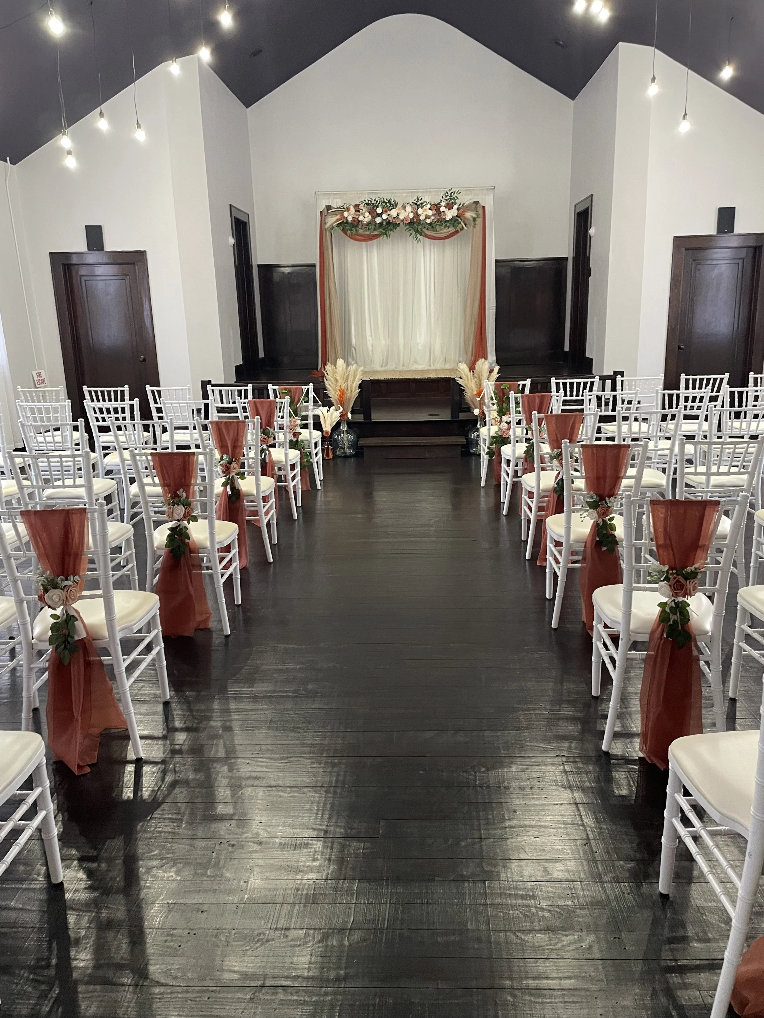 Full access to the whole venue, this includes both the ceremony and reception space, prep kitchen and both the bridal and groomsmen suites. In house staff member and coordinators. Plus 1 hours Friday evening for rehearsal. Use of our linens and decor, this includes tablecloths, chair covers, table runners, napkins, chair sashes, arch drapery, centerpieces, candle holders, candles, florals, garlands, signs, flower walls, arches, photo backdrops, full set of real dinnerware, serving trays, drink dispensers, chaffing dishes and more. 5 hours of bartending, Ordained Minister, 6 hours of DJ service and catering. Service for up to 85 guests.