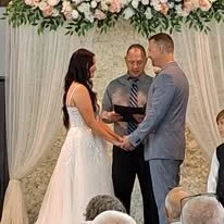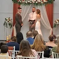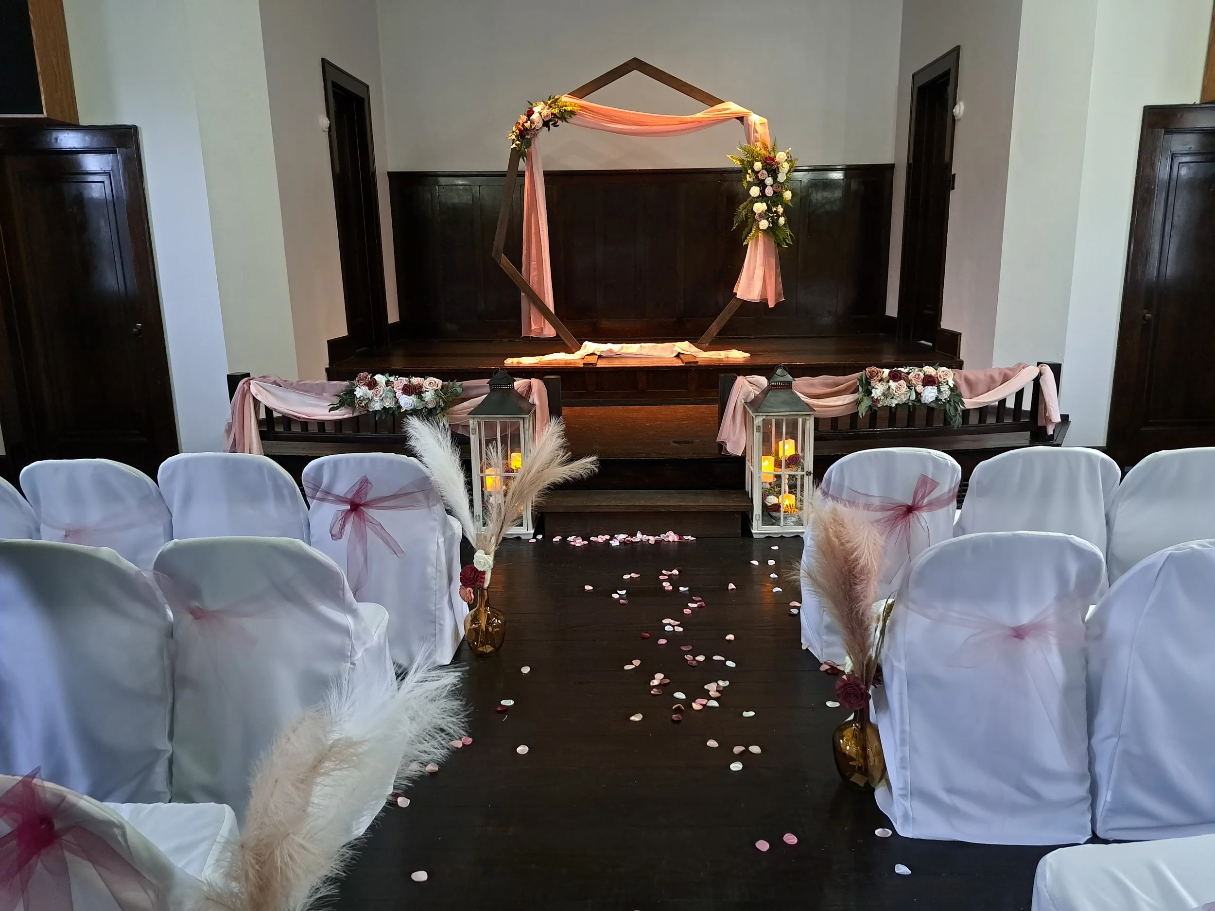 Use of the beautiful ceremony space for 3 hours, fully decorated with an arch, drapery and floral swag, stage drapery with flowers, 4 white pedestals with beautiful flower balls on them, and a welcome sign. Ceremony music, and an Ordained Minister. Service for up to 85 people.